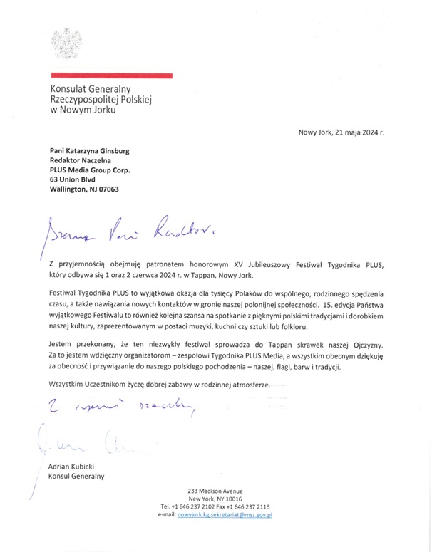 Z dumą informujemy, że XV Festiwal Tygodnika PLUS po raz kolejny został objęty patronatem honorowym Konsulatu Generalnego Rzeczypospolitej Polskiej w Nowym Jorku.
